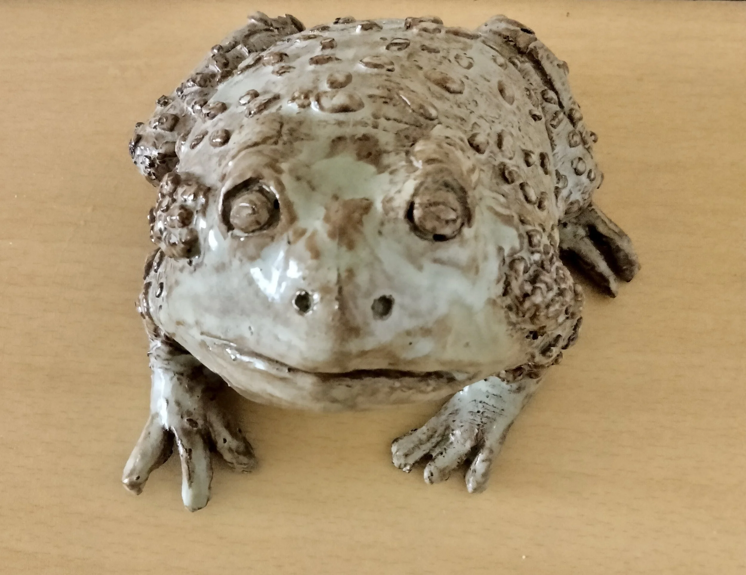 A very realistic toad, warts and all! He is a little over 6” from nose (nares) to back end (anus). Mostly hollow inside. $35.00